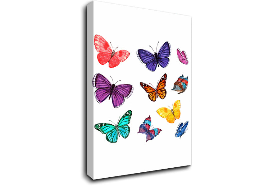 Rainbow Butterflies Canvas Print handmade in the UK. Stretched over a 2 inch thick wooden box frame, ready to hang on your wall.