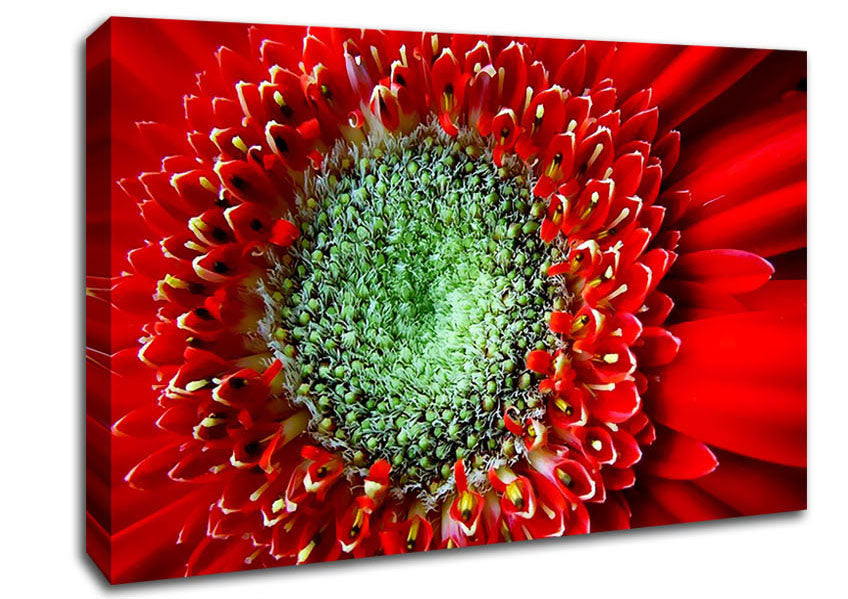 Red Gerbera Green Centre Close-Up Canvas Print handmade in the UK. Stretched over a 2 inch thick wooden box frame, ready to hang on your wall.