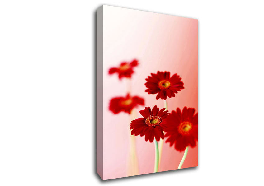 Red Gerberas On Pink Canvas Print handmade in the UK. Stretched over a 2 inch thick wooden box frame, ready to hang on your wall.