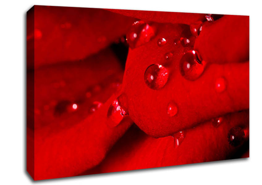 Red Petal Dew Drop Canvas Print handmade in the UK. Stretched over a 2 inch thick wooden box frame, ready to hang on your wall.