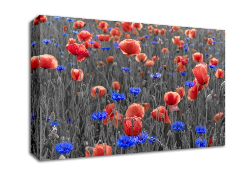 Red poppies blue field Canvas Print handmade in the UK. Stretched over a 2 inch thick wooden box frame, ready to hang on your wall.