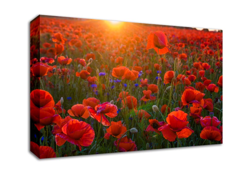 Red poppies under the sunset Canvas Print handmade in the UK. Stretched over a 2 inch thick wooden box frame, ready to hang on your wall.