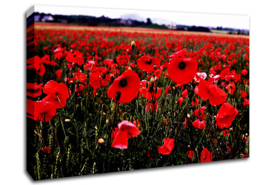 Red Poppy Field Hills Canvas Print handmade in the UK. Stretched over a 2 inch thick wooden box frame, ready to hang on your wall.