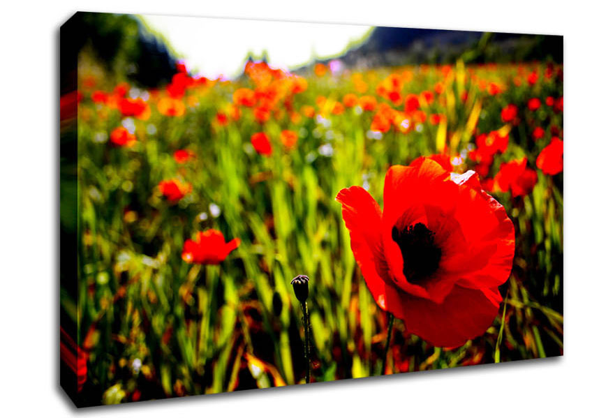 Red Poppy Fields In Golden Sunlight Canvas Print handmade in the UK. Stretched over a 2 inch thick wooden box frame, ready to hang on your wall.