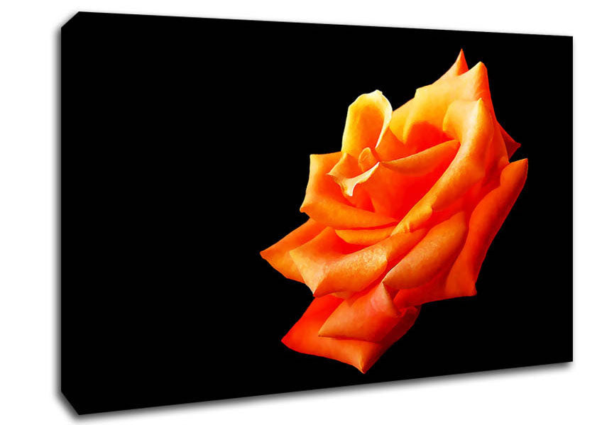 Single Orange Rose In Bloom Canvas Print handmade in the UK. Stretched over a 2 inch thick wooden box frame, ready to hang on your wall.