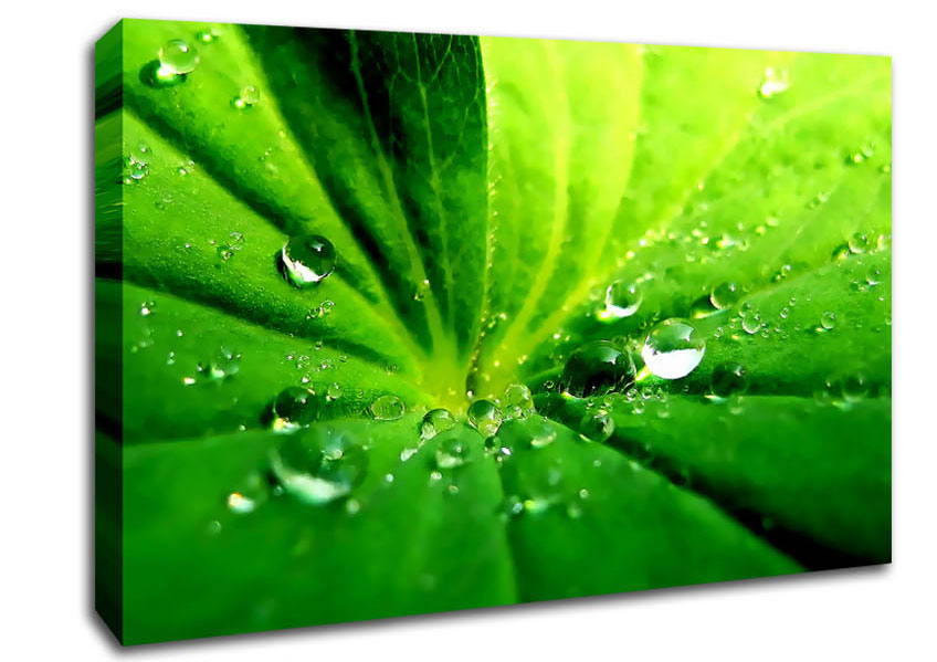 Sunlit Leaf Droplets Canvas Print handmade in the UK. Stretched over a 2 inch thick wooden box frame, ready to hang on your wall.