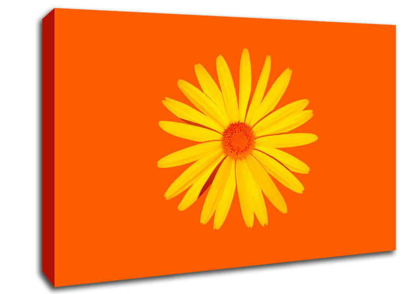 Yellow Daisy Face On Orange Canvas Print handmade in the UK. Stretched over a 2 inch thick wooden box frame, ready to hang on your wall.