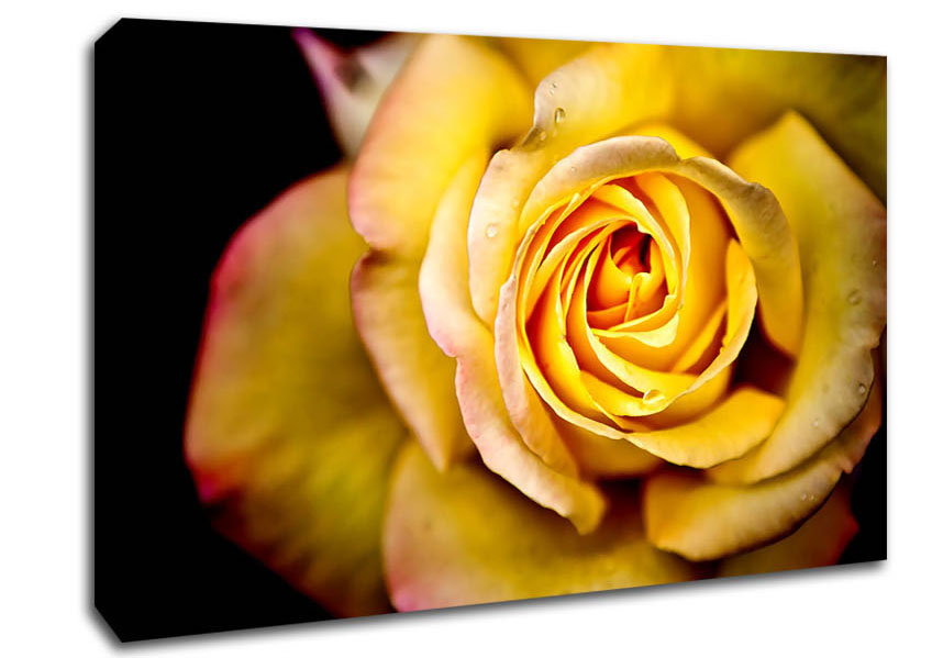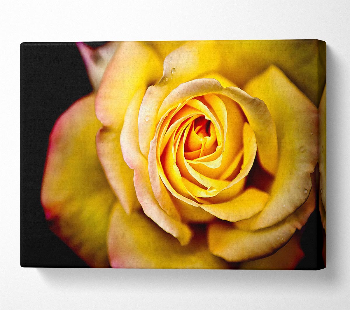 Yellow Rose Dew Drop Canvas Print handmade in the UK. Stretched over a 2 inch thick wooden box frame, ready to hang on your wall.