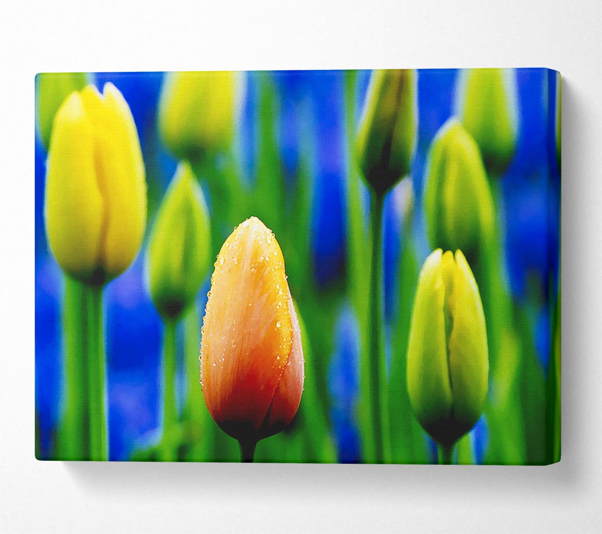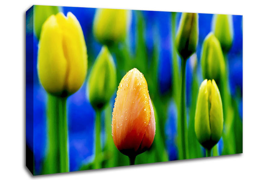 Yellow Tulips In A Blue Field Canvas Print handmade in the UK. Stretched over a 2 inch thick wooden box frame, ready to hang on your wall.