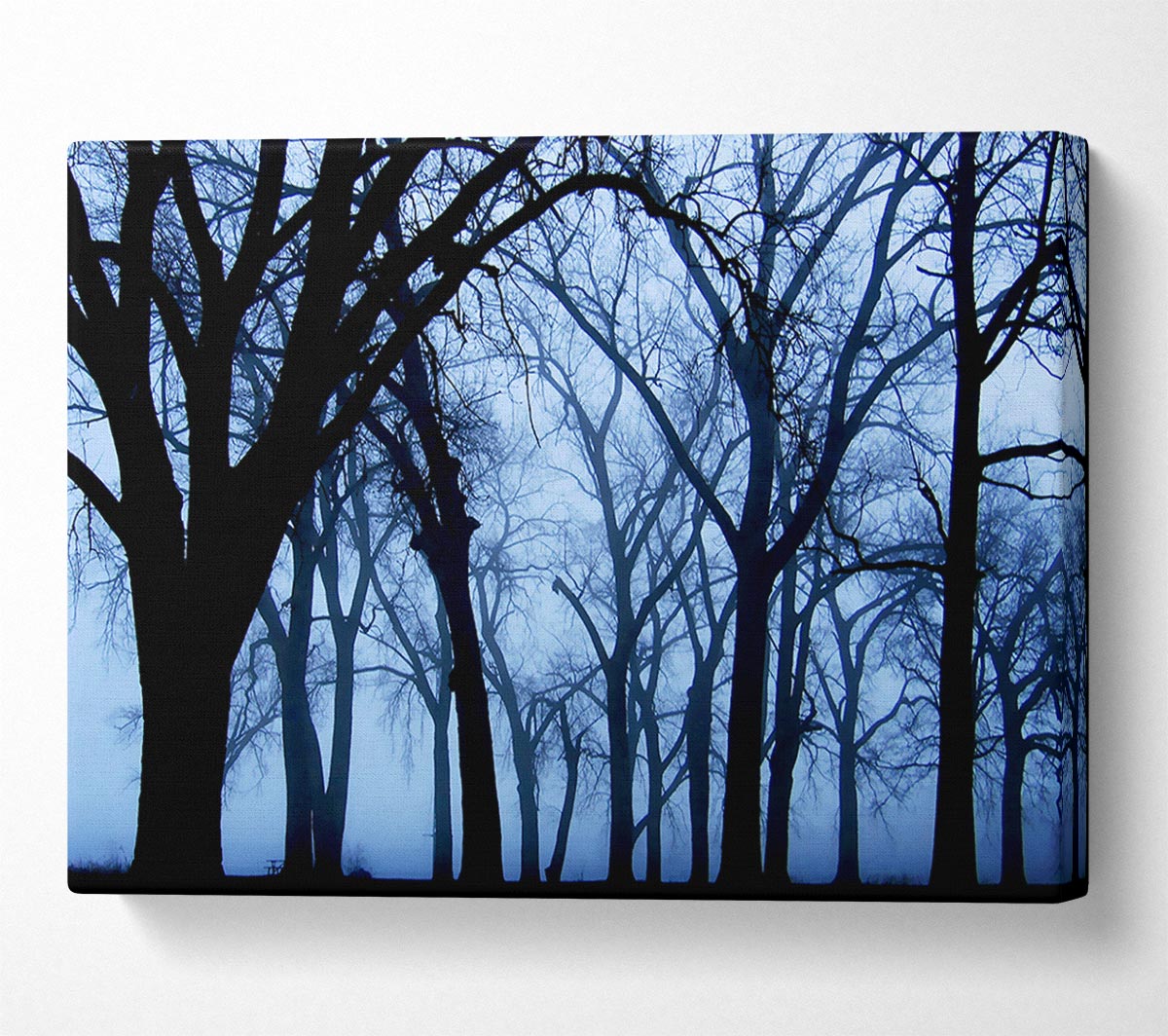Blue Night Forest Canvas Print handmade in the UK. Stretched over a 2 inch thick wooden box frame, ready to hang on your wall.