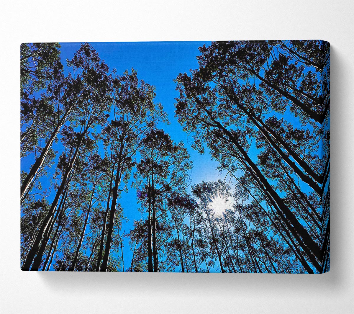 Blue Tree Top Skys Canvas Print handmade in the UK. Stretched over a 2 inch thick wooden box frame, ready to hang on your wall.