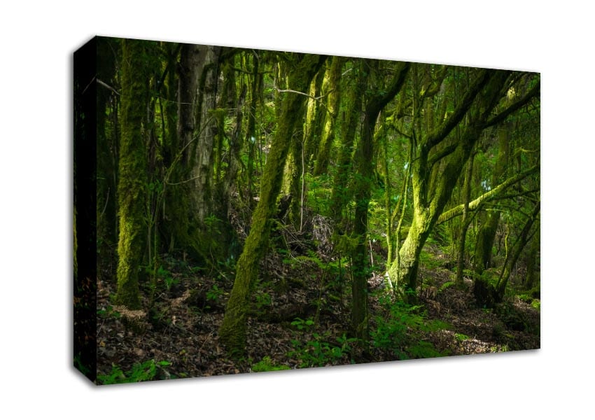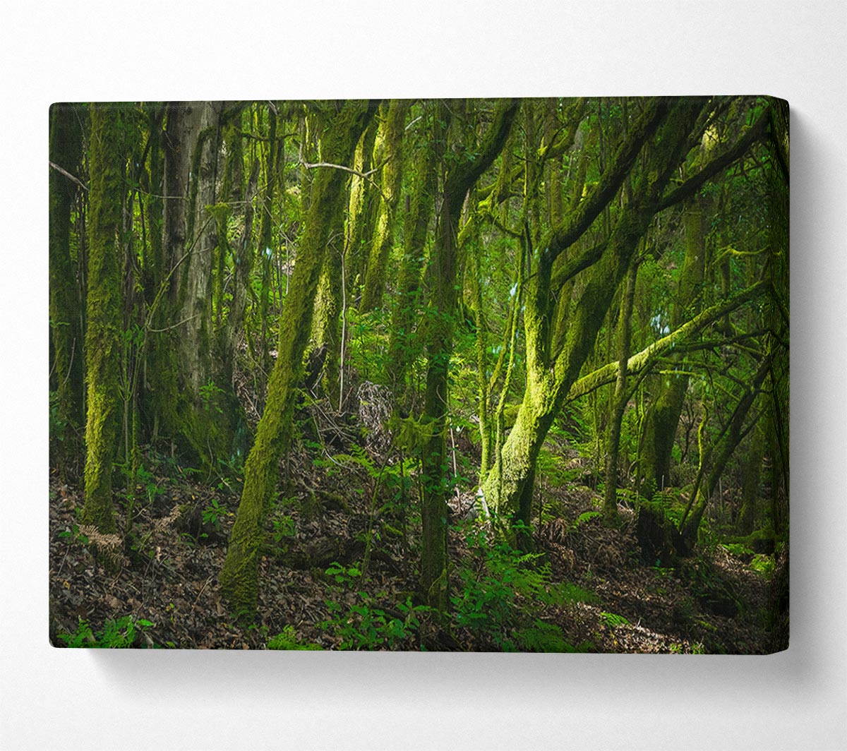 Dense Green Mossy Forest Canvas Print handmade in the UK. Stretched over a 2 inch thick wooden box frame, ready to hang on your wall.