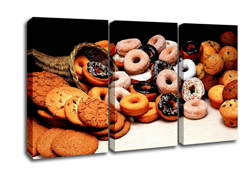 Donuts And Cookies 3 Panel Canvas Print handmade in the UK. Stretched over a 2 inch thick wooden box frame, ready to hang on your wall.