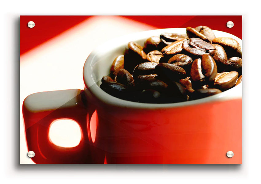 Red Coffee Bean Mug Acrylic Print , UV printed on 5mm thick acrylic. Hang it straight from the box with the provide standoffs.