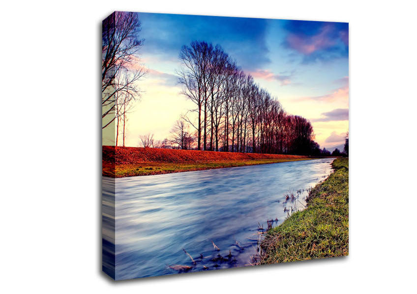 Countryside Stream At Sunset Square Canvas Print handmade in the UK. Stretched over a 2 inch thick wooden box frame, ready to hang on your wall.