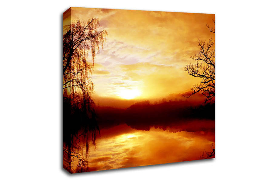 Golden Clouds Over The Lake Square Canvas Print handmade in the UK. Stretched over a 2 inch thick wooden box frame, ready to hang on your wall.