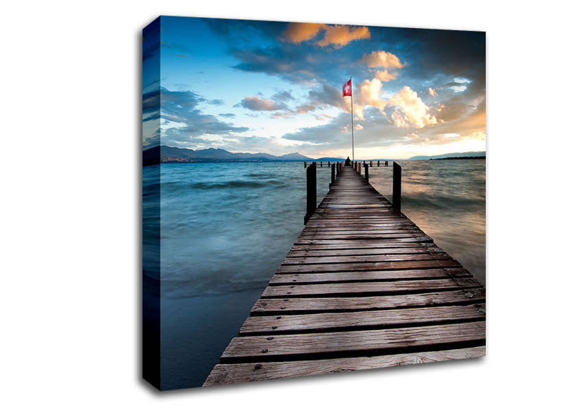 Lake Pontoon At Dusk Square Canvas Print handmade in the UK. Stretched over a 2 inch thick wooden box frame, ready to hang on your wall.