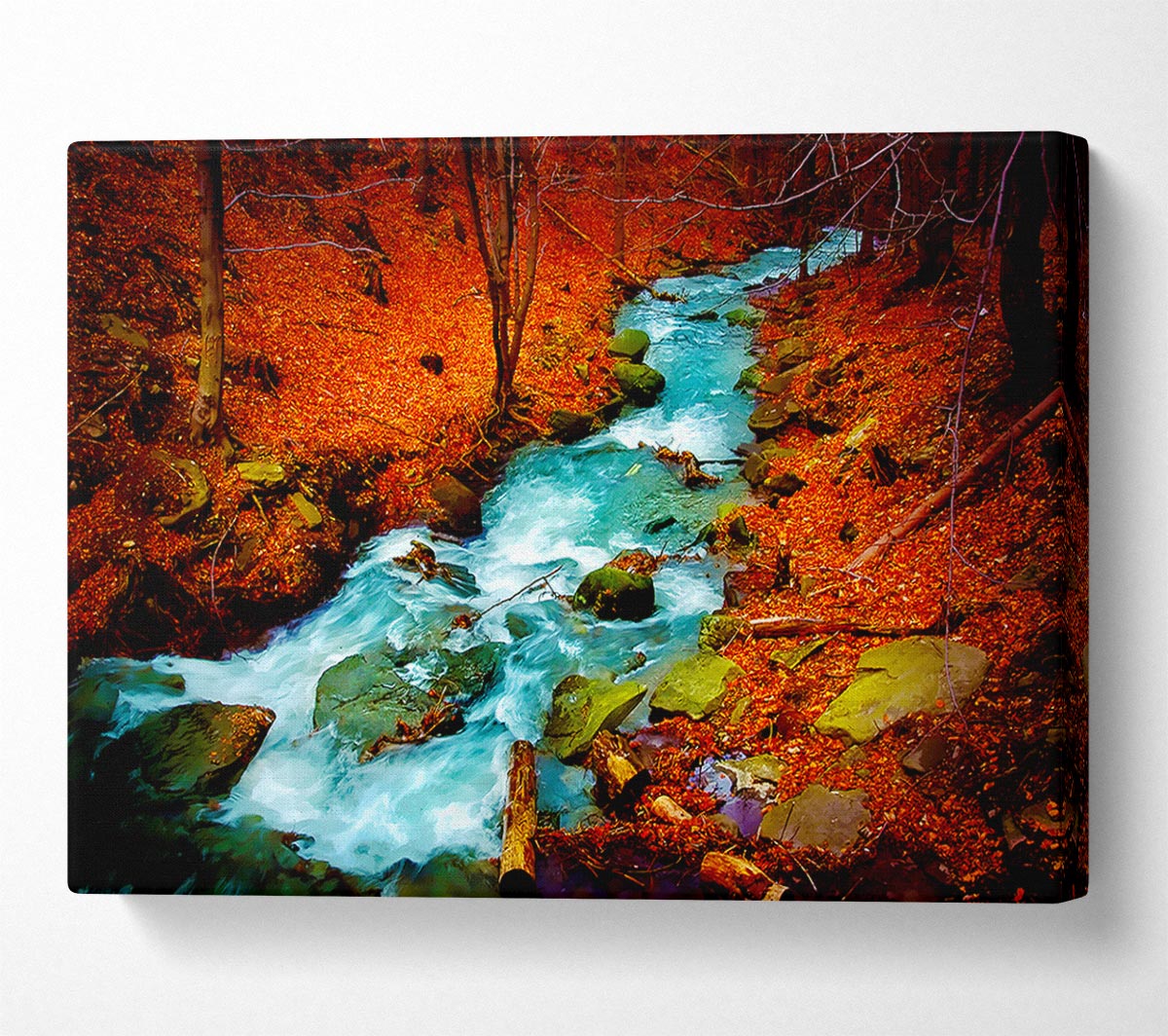 Red Autumn Stream Canvas Print handmade in the UK. Stretched over a 2 inch thick wooden box frame, ready to hang on your wall.