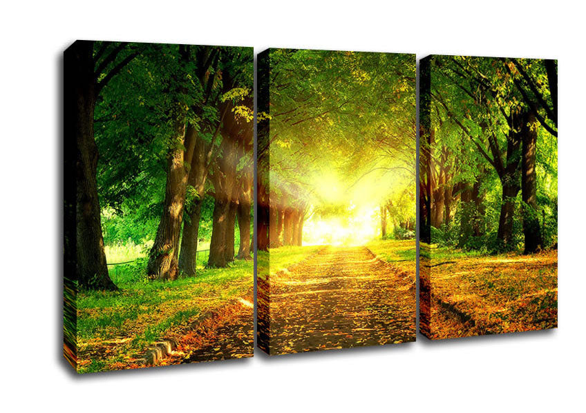 Autumn Path 3 Panel Canvas Print handmade in the UK. Stretched over a 2 inch thick wooden box frame, ready to hang on your wall.