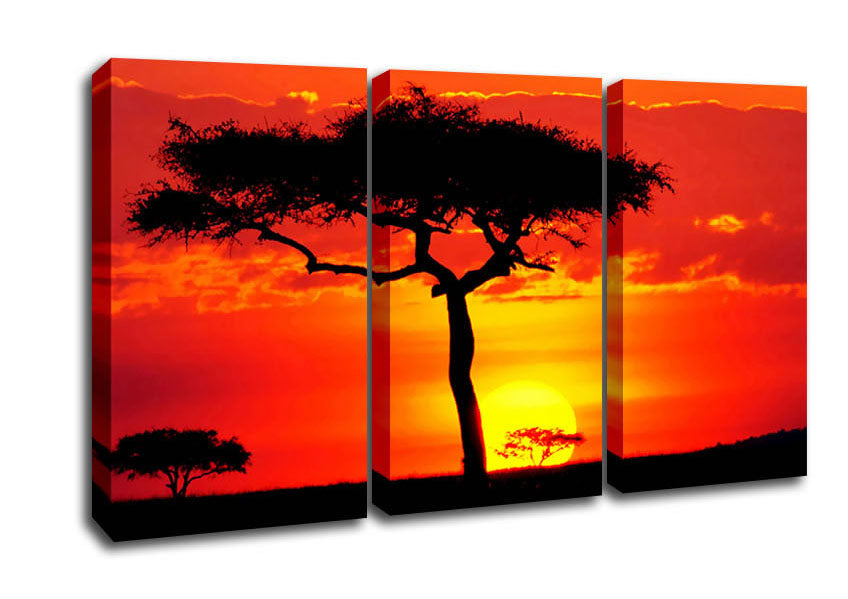 Glowing Orange African Tree 3 Panel Canvas Print handmade in the UK. Stretched over a 2 inch thick wooden box frame, ready to hang on your wall.