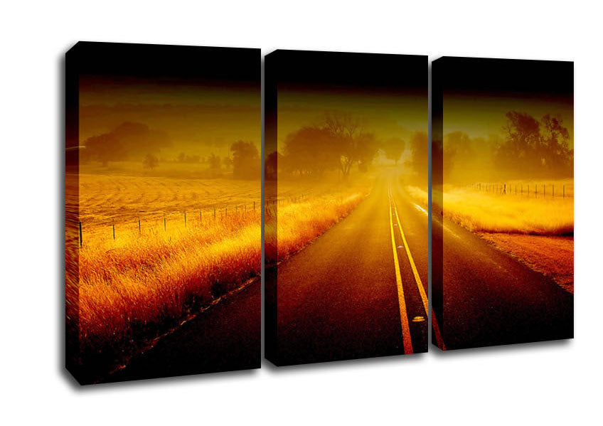 Misty Road 3 Panel Canvas Print handmade in the UK. Stretched over a 2 inch thick wooden box frame, ready to hang on your wall.
