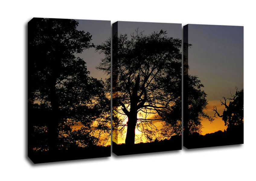 Morning Sun Trees 3 Panel Canvas Print handmade in the UK. Stretched over a 2 inch thick wooden box frame, ready to hang on your wall.