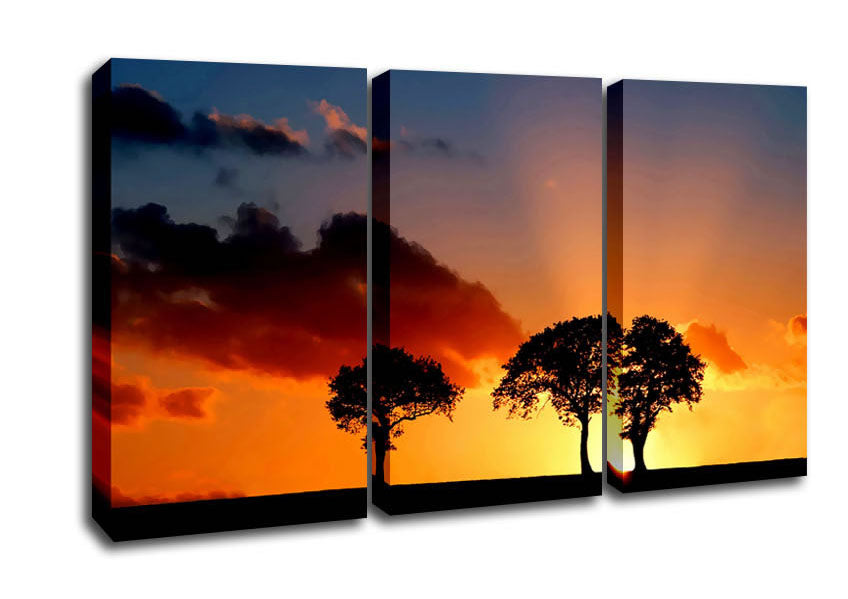 Morning Sunrise Peaking Through The Trees 3 Panel Canvas Print handmade in the UK. Stretched over a 2 inch thick wooden box frame, ready to hang on your wall.