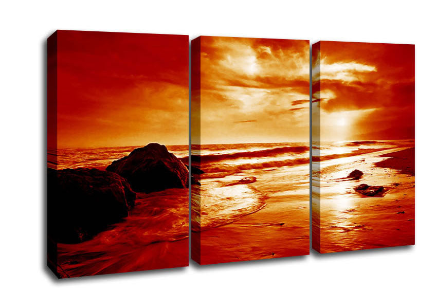 Orange Ocean Boulders 3 Panel Canvas Print handmade in the UK. Stretched over a 2 inch thick wooden box frame, ready to hang on your wall.