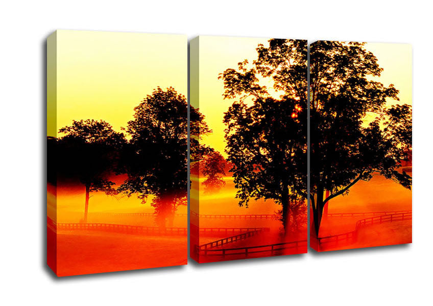 Orange Treeline Mist 3 Panel Canvas Print handmade in the UK. Stretched over a 2 inch thick wooden box frame, ready to hang on your wall.