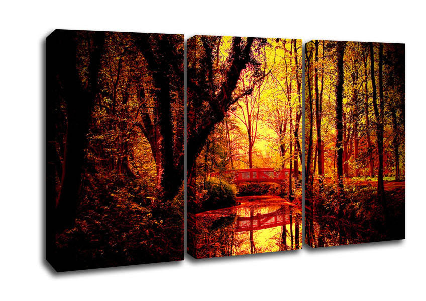 Park Bridge Autumn 3 Panel Canvas Print handmade in the UK. Stretched over a 2 inch thick wooden box frame, ready to hang on your wall.