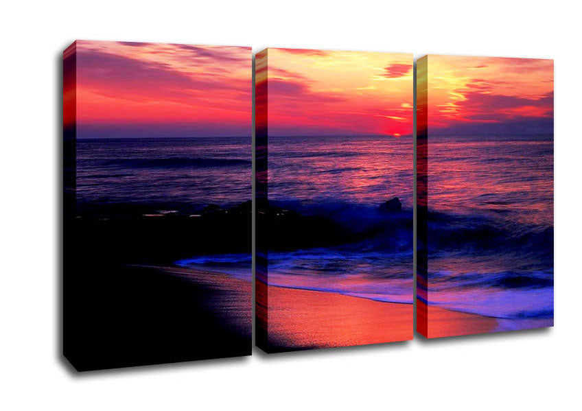 Stunning Red Distant Sun Ocean 3 Panel Canvas Print handmade in the UK. Stretched over a 2 inch thick wooden box frame, ready to hang on your wall.