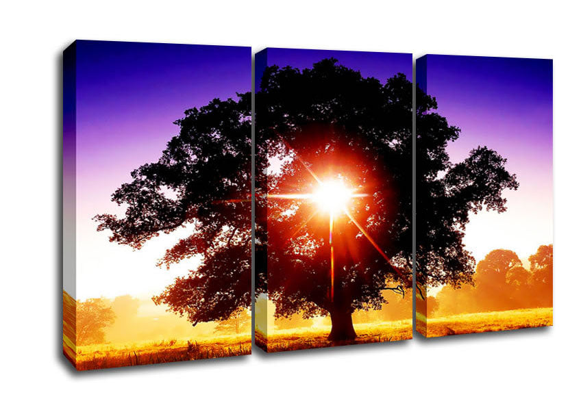 Sun Burst Through The Tree 3 Panel Canvas Print handmade in the UK. Stretched over a 2 inch thick wooden box frame, ready to hang on your wall.