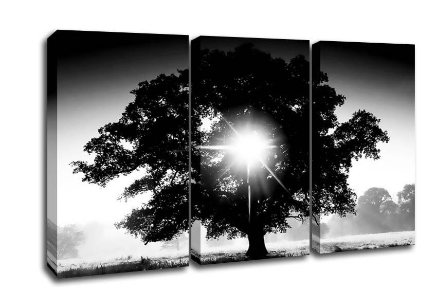 Sun Through The Tree B n W 3 Panel Canvas Print handmade in the UK. Stretched over a 2 inch thick wooden box frame, ready to hang on your wall.