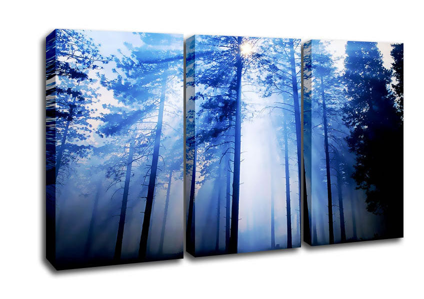 Sunlight Mist Through The Trees 3 Panel Canvas Print handmade in the UK. Stretched over a 2 inch thick wooden box frame, ready to hang on your wall.