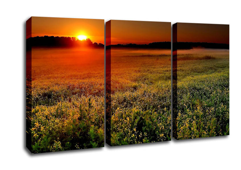 Sunset Over The Field 3 Panel Canvas Print handmade in the UK. Stretched over a 2 inch thick wooden box frame, ready to hang on your wall.