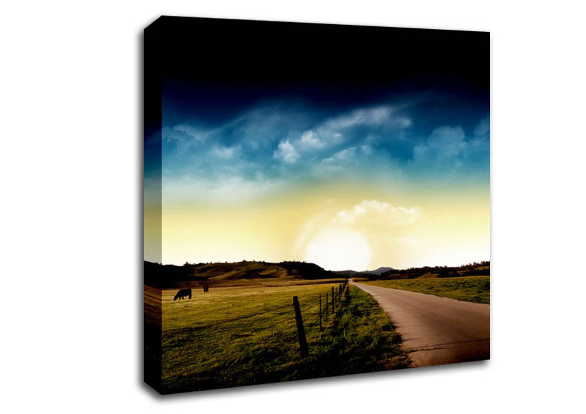Stunning Country Road Skies Square Canvas Print handmade in the UK. Stretched over a 2 inch thick wooden box frame, ready to hang on your wall.