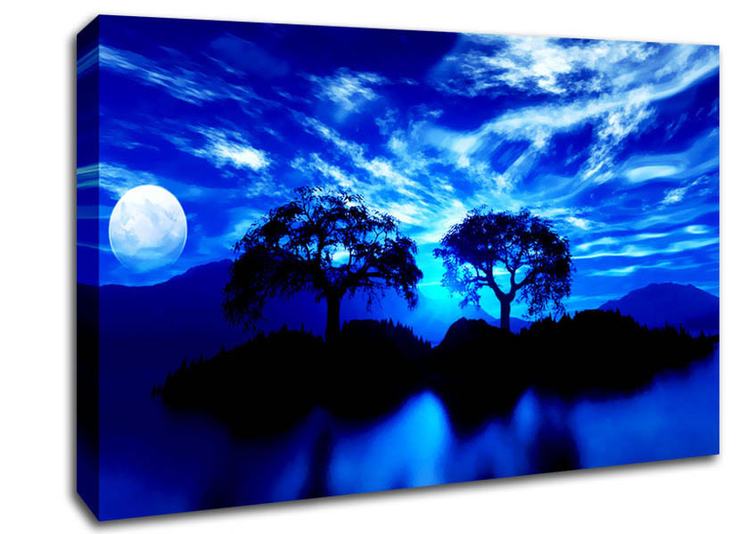 Blue Twin Island Moon Canvas Print handmade in the UK. Stretched over a 2 inch thick wooden box frame, ready to hang on your wall.