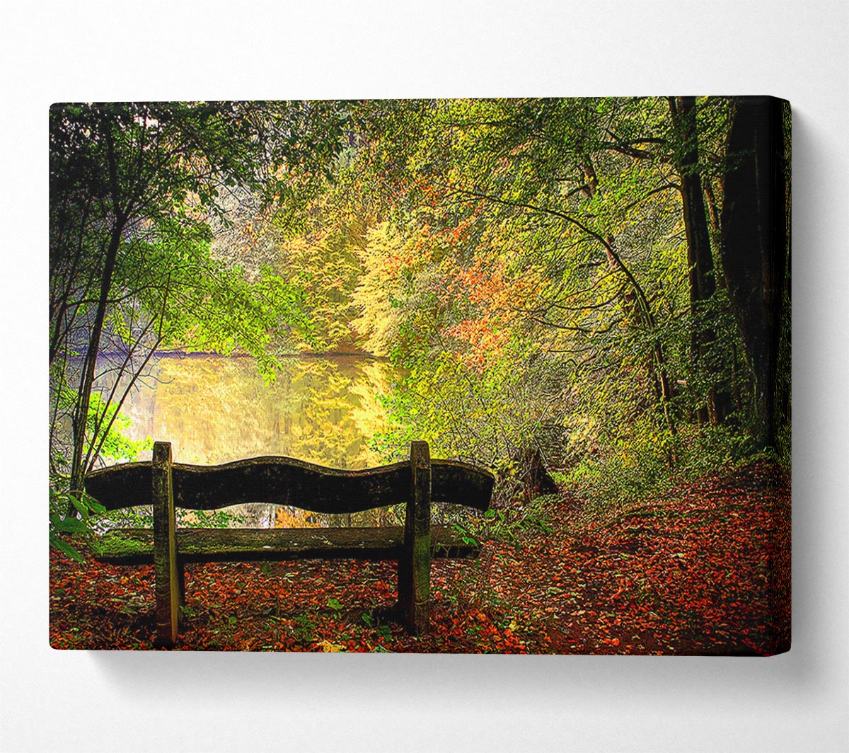 Empty Bench In Fall Scene Canvas Print handmade in the UK. Stretched over a 2 inch thick wooden box frame, ready to hang on your wall.