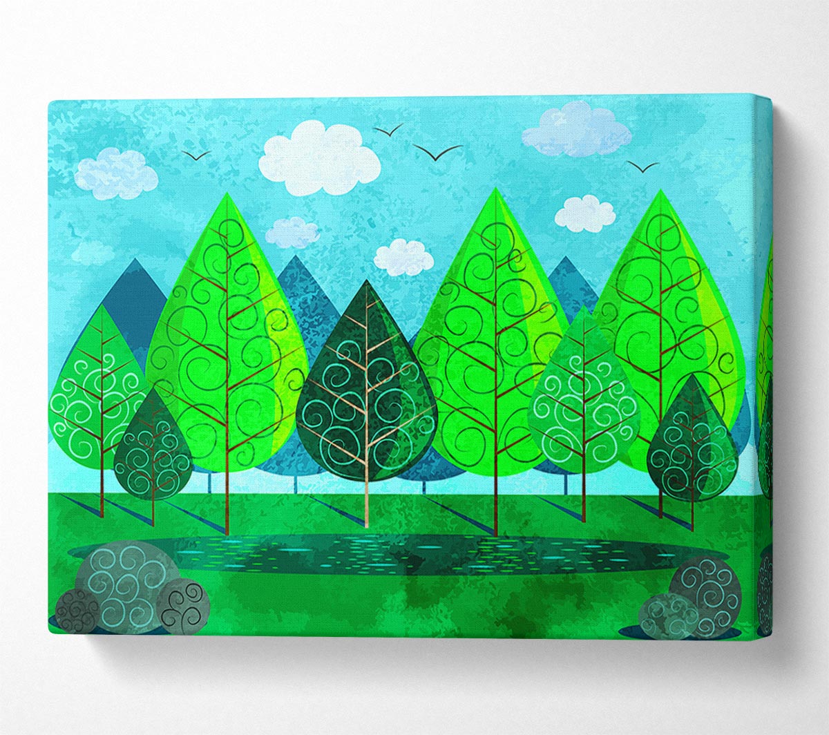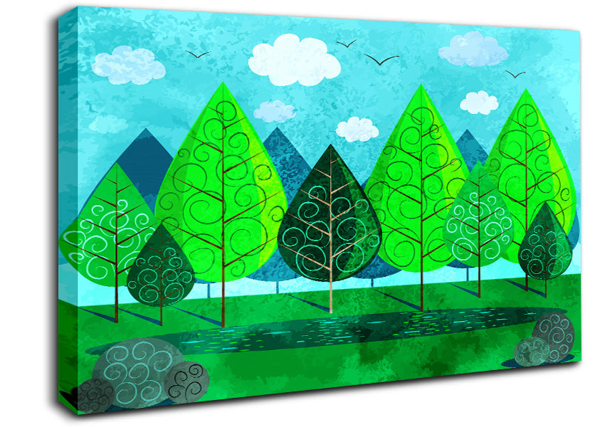 Green Tree Swirl Canvas Print handmade in the UK. Stretched over a 2 inch thick wooden box frame, ready to hang on your wall.