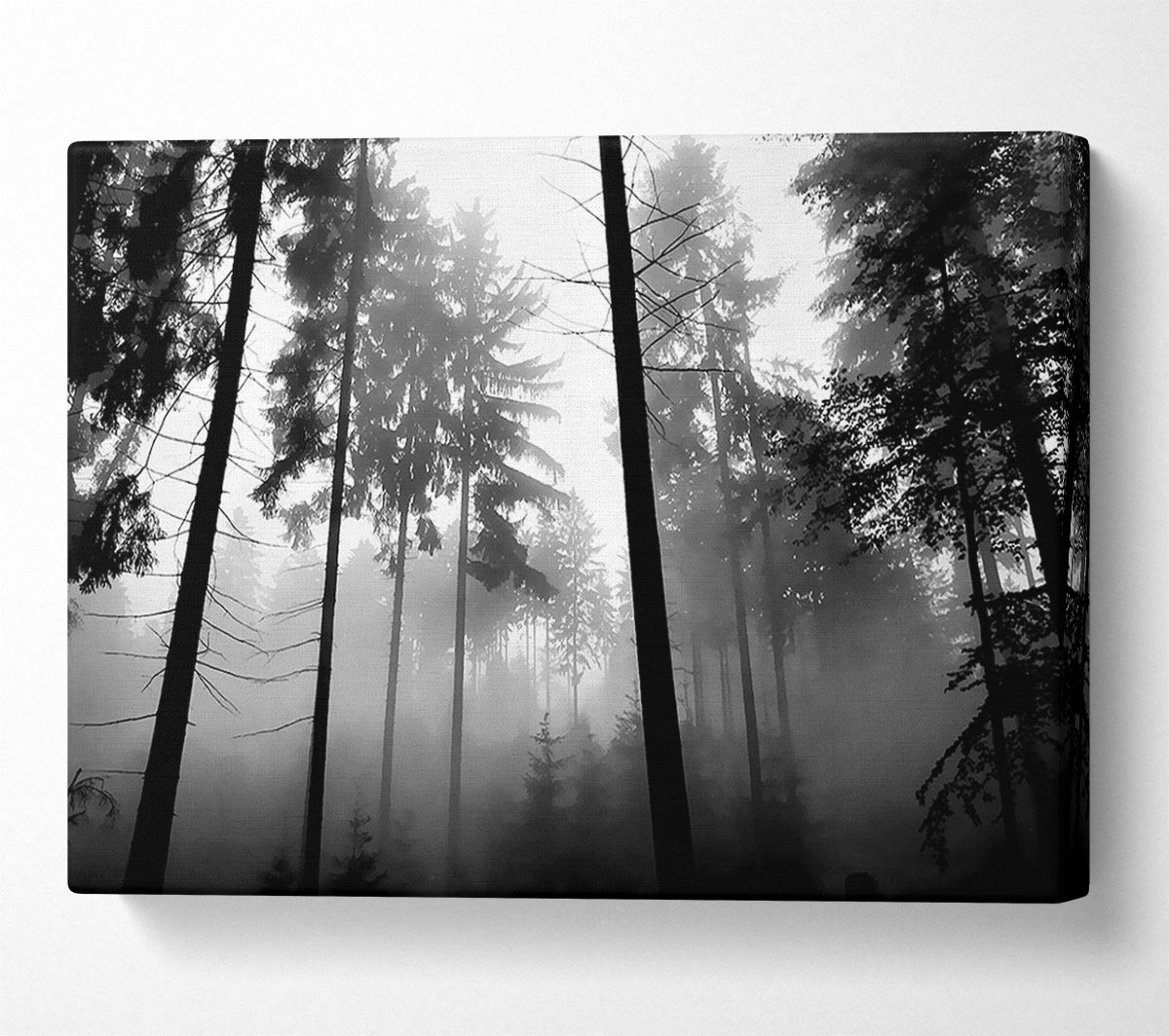 Mist Of The Woodland B n W Canvas Print handmade in the UK. Stretched over a 2 inch thick wooden box frame, ready to hang on your wall.