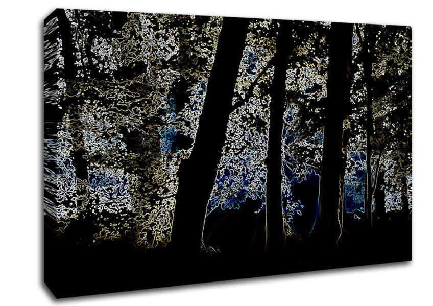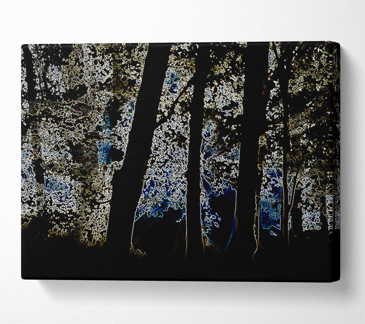 Neon Forrest At Night Canvas Print handmade in the UK. Stretched over a 2 inch thick wooden box frame, ready to hang on your wall.