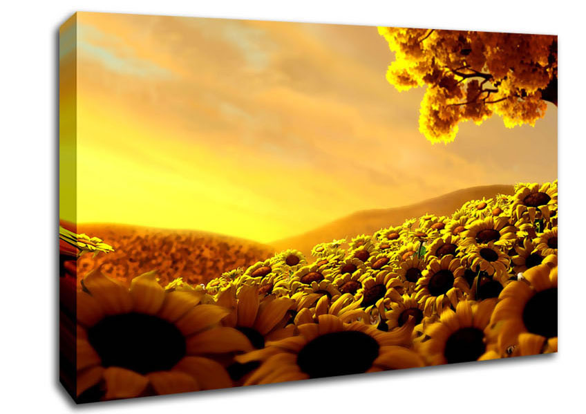 Sun Flower World Canvas Print handmade in the UK. Stretched over a 2 inch thick wooden box frame, ready to hang on your wall.