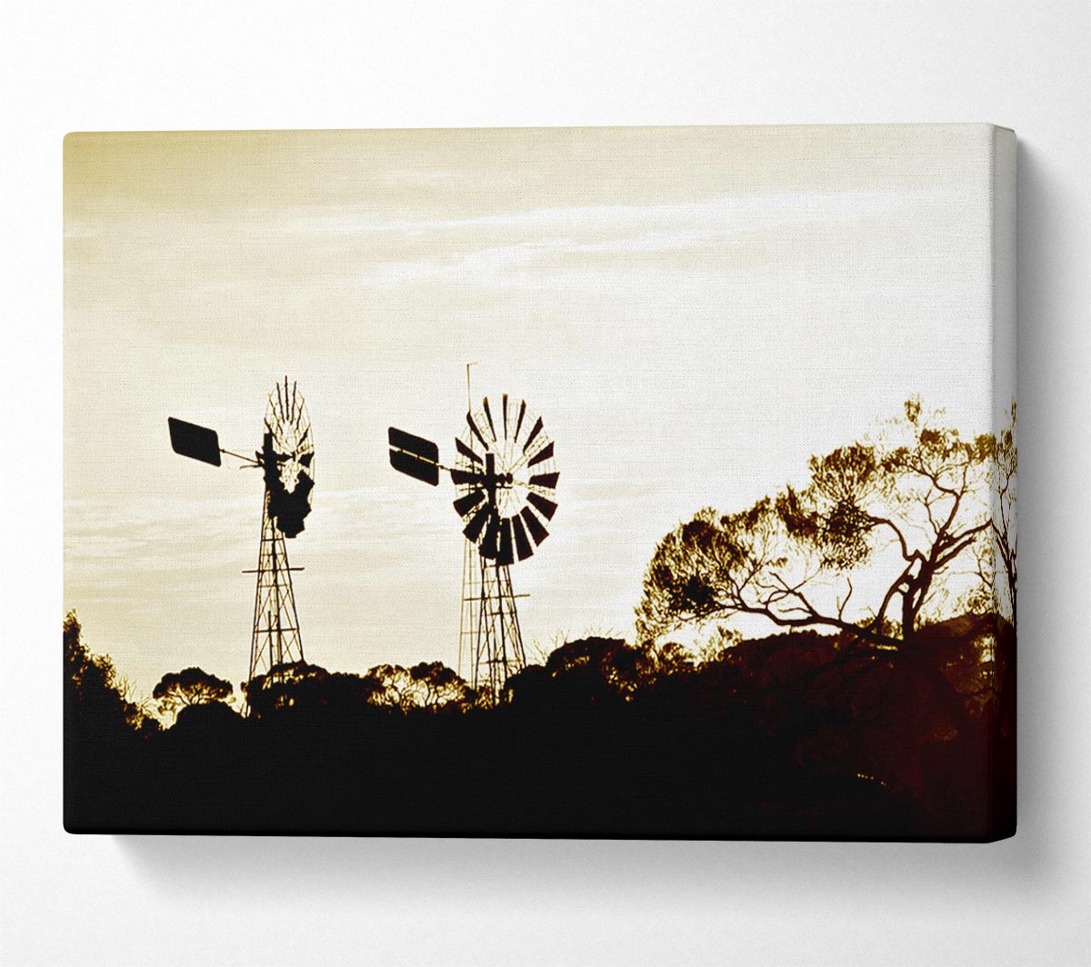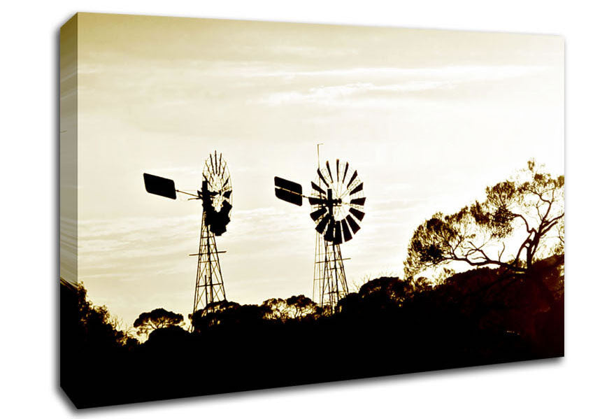Windmills Sepia Canvas Print handmade in the UK. Stretched over a 2 inch thick wooden box frame, ready to hang on your wall.