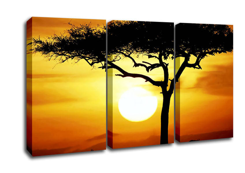 African Safari Tree In Sunlight 3 Panel Canvas Print handmade in the UK. Stretched over a 2 inch thick wooden box frame, ready to hang on your wall.