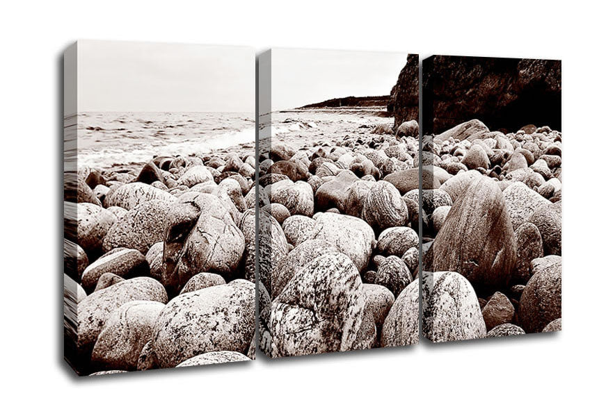 Pebbles Of The Ocean Brown 3 Panel Canvas Print handmade in the UK. Stretched over a 2 inch thick wooden box frame, ready to hang on your wall.
