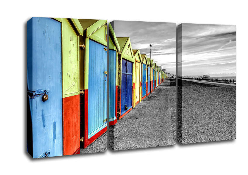 Rainbow Of Huts 3 Panel Canvas Print handmade in the UK. Stretched over a 2 inch thick wooden box frame, ready to hang on your wall.