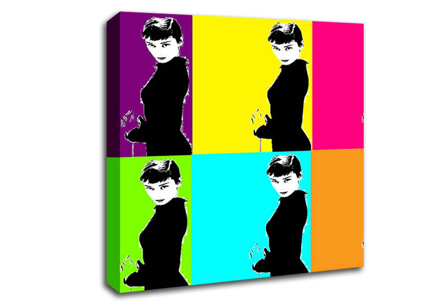 Audrey Hepburn Pop Art Square Canvas Print handmade in the UK. Stretched over a 2 inch thick wooden box frame, ready to hang on your wall.