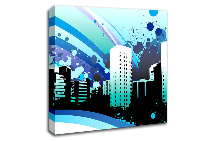 Blue City Square Canvas Print handmade in the UK. Stretched over a 2 inch thick wooden box frame, ready to hang on your wall.