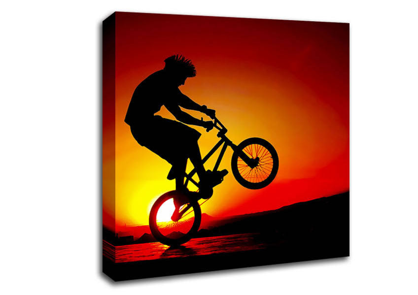 Bmx Back Wheelie In Red Sunlight Square Canvas Print handmade in the UK. Stretched over a 2 inch thick wooden box frame, ready to hang on your wall.