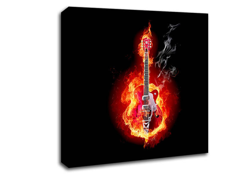 Red Guitar Flames Square Canvas Print handmade in the UK. Stretched over a 2 inch thick wooden box frame, ready to hang on your wall.